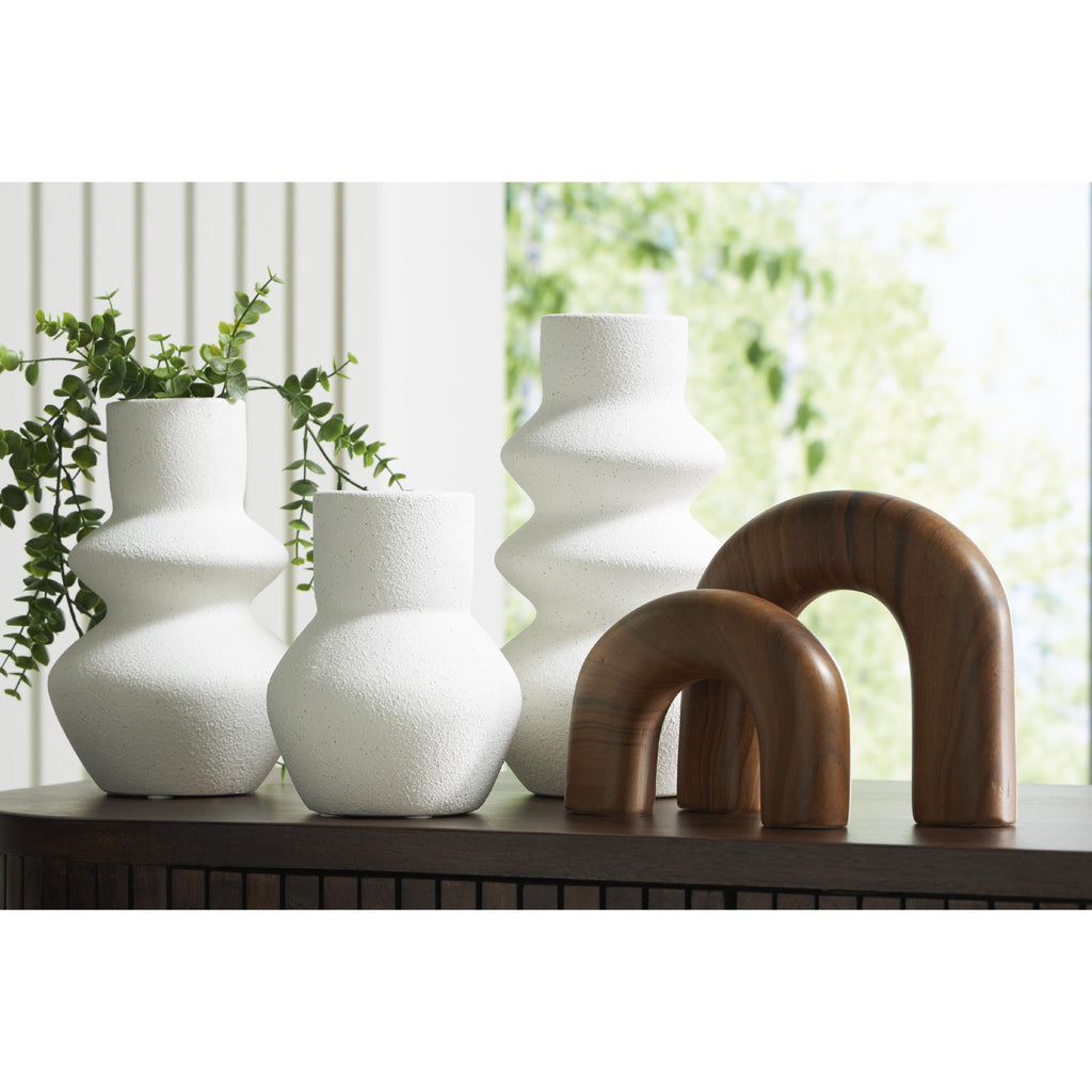 An eclectic mix of mod forms with faux wood and white finishes, this accessory set is a simply riveting ensemble. Its casual style is part classic, part contemporary and totally cool. Stage the pieces together for maximum impact, or spread them across your sanctuary to bring a cohesive look and feel from room to room.
