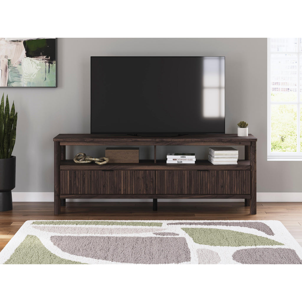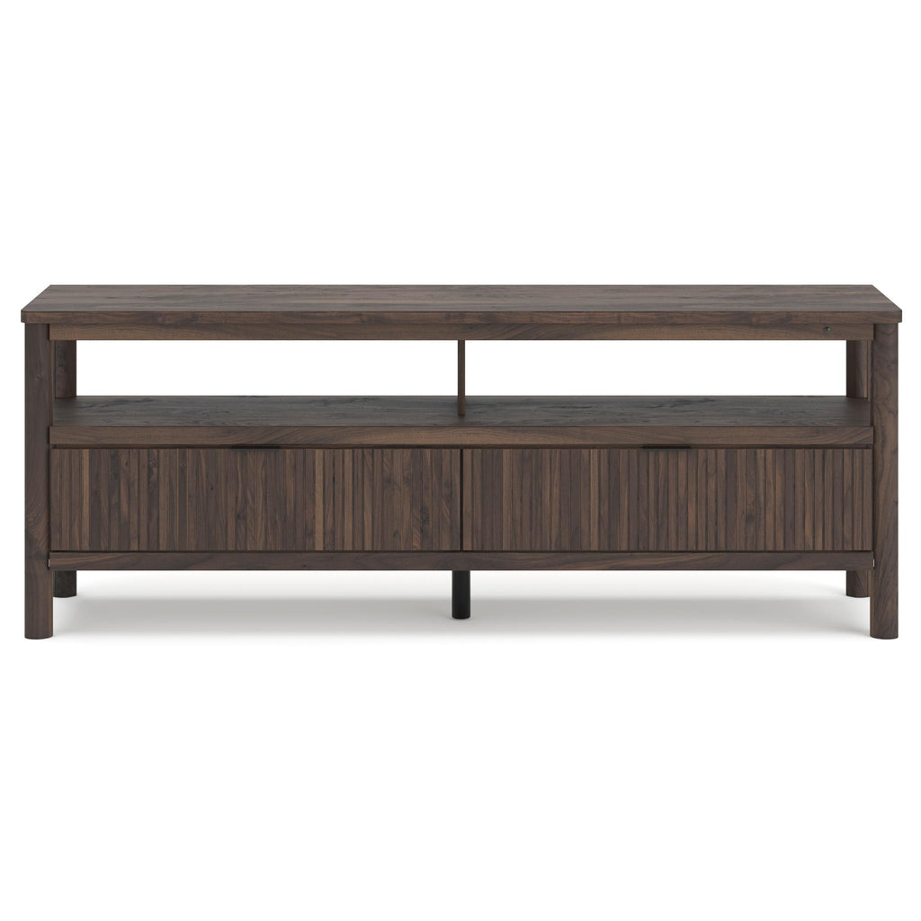 Crafted with both form and function in mind, this TV stand brings a dash of retro-cool character to your modern boho aesthetic. A reeded design on its drawers adds an on-trend touch to storing entertainment essentials. Warmly welcoming with a rich brown finish, the TV stand pairs well with muted hues, earth tones and other neutrals alike. And for added ambiance, lighting under the top brings a cool vibe to your favorite shows or video gaming. What a refined take on easygoing style.