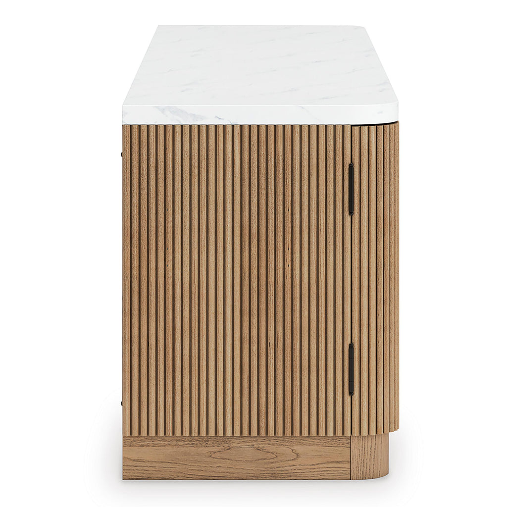 Elegance meets earthy charm in this TV stand. Crafting a contemporary living room? The faux marble top expertly pairs with the reeded base for a trend-right take on day-to-day function. Open shelving and subtly integrated storage cabinets make it easy to store and display media accessories in style.