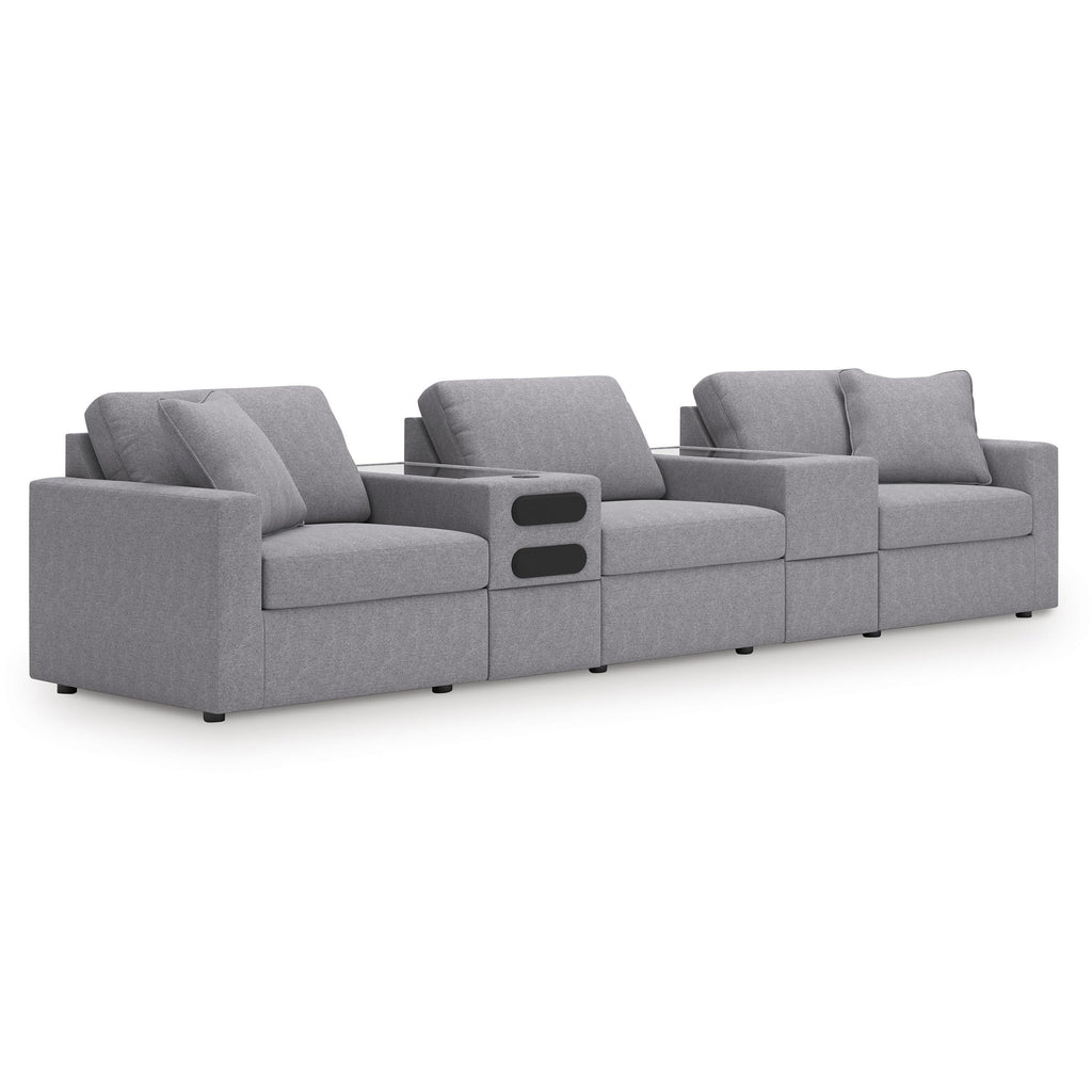 • Includes 5 modular pieces: left-arm facing corner chair, audio console with storage, console with storage, armless chair and right-arm facing corner chair