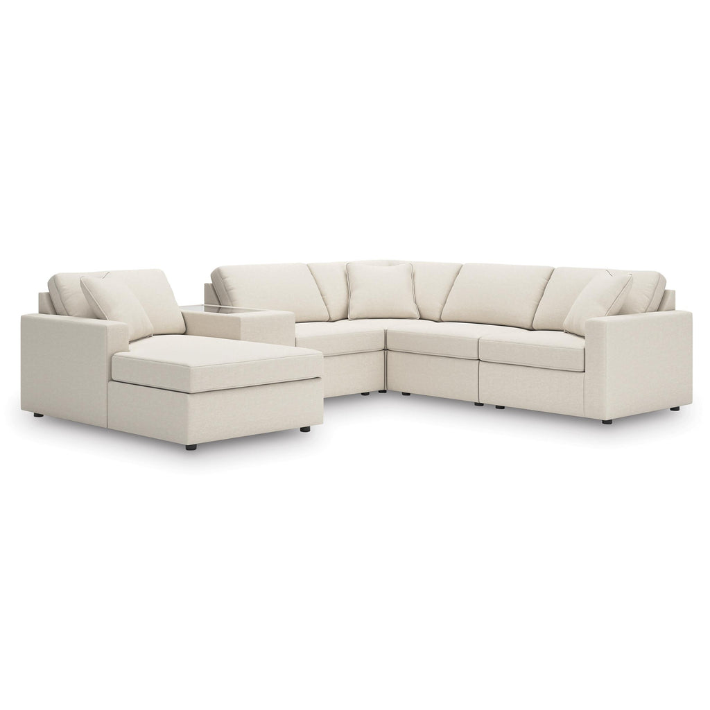 • Includes 6 modular pieces: left-arm facing corner chaise, 2 armless chairs, console with storage, wedge and right-arm facing corner chair