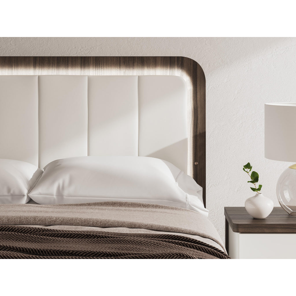 Vous cherchez à faire une déclaration subtilement frappante dans votre chambre à coucher? On s’occupe de toi. Le traitement sophistiqué... Vous cherchez à faire une déclaration subtilement frappante dans votre chambre à coucher? On s’occupe de toi. Le traitement sophistiqué bicolore de ce lit queen rembourré marie une finition brun chaud sur un grain de noyer répliqué avec une finition blanche mate. Rehaussée d’un magnifique faux cuir blanc, la tête de lit offre un éclairage ambiant chaleureux pour cette ambiance chaleureuse que nous aimons tous au coucher. Les coins arrondis dégagent une aura de panache moderne. C’est une leçon magistrale sur le caractère contemporain mais confortable. Voir plus