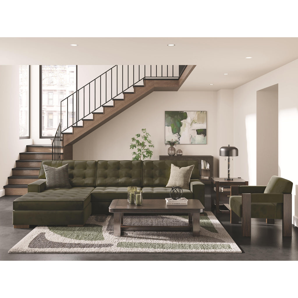 Cet élégant sectionnel avec chaise longue offre un look très contemporain avec beaucoup d’espace pour s’étaler. Des détails capitonnés spectaculaires et une sellerie luxueuse dans une riche couleur olive créent une atmosphère sophistiquée. Le sectionnel est parfait pour ceux qui aiment se divertir, ou simplement se détendre, dans le style et le confort du centre-ville.