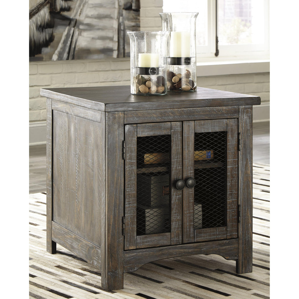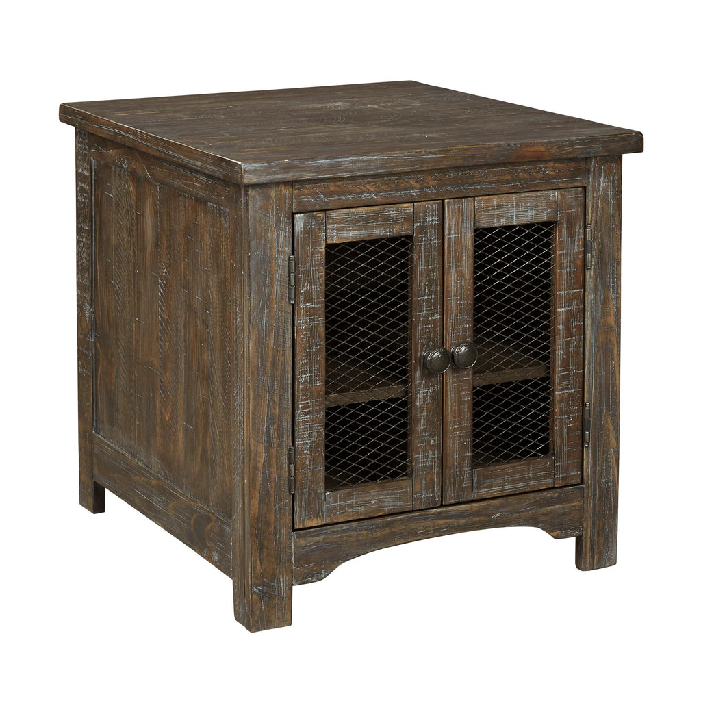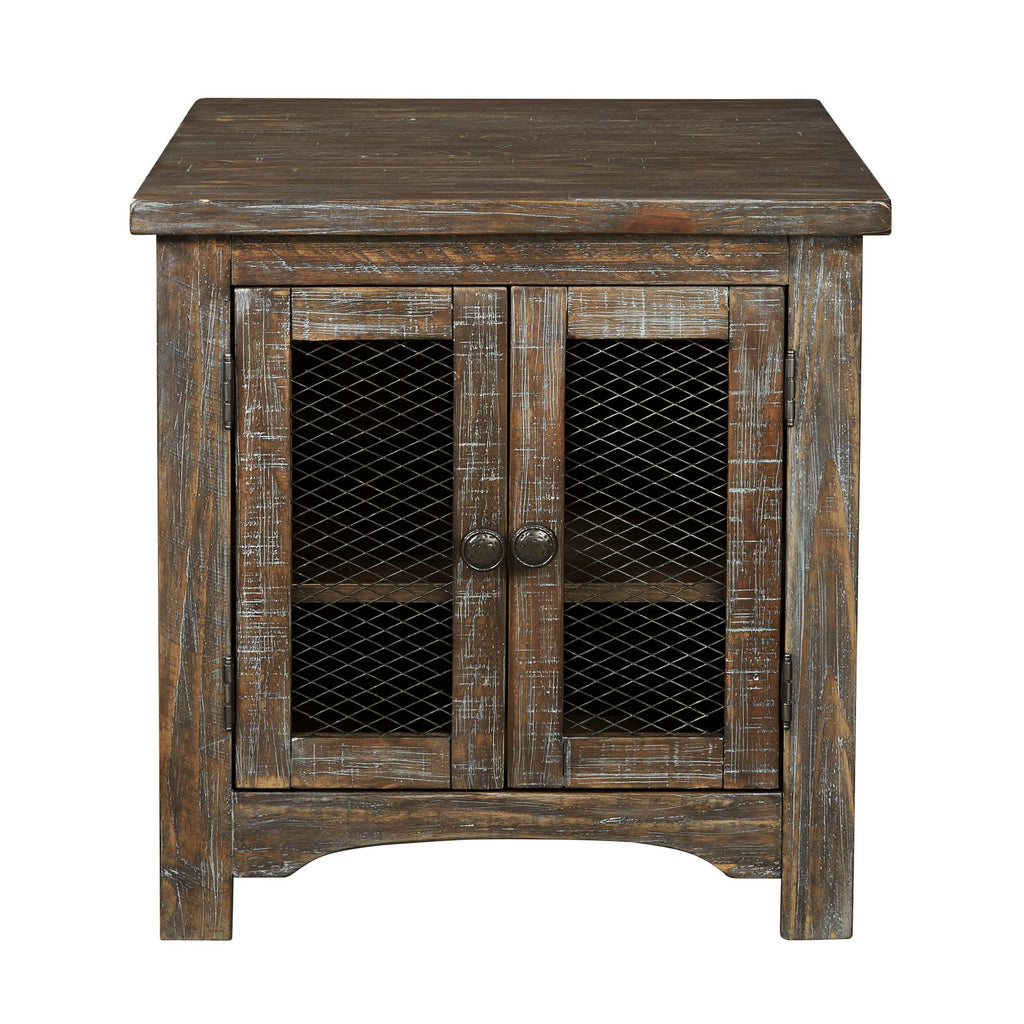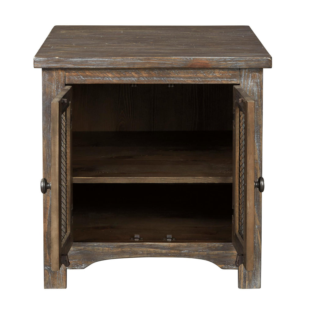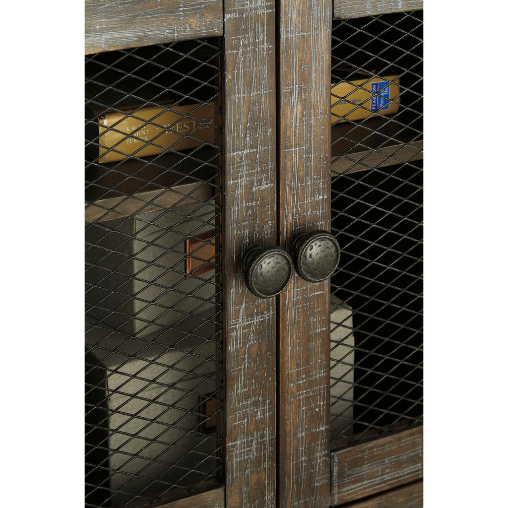 • Portes d'armoire doubles avec grille métallique encastrée révélant un rangement à étagère unique